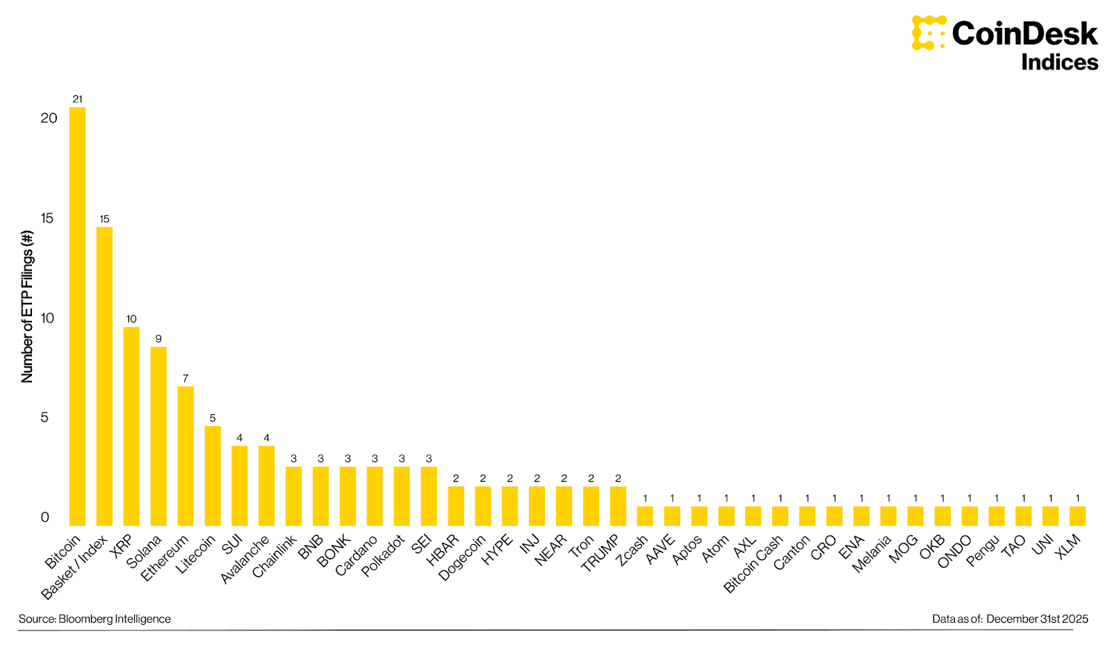 A joint SEC–CFTC ruling on March 17 designated 16 assets, including SOL, $XRP and DOGE, as digital commodities and thus outside the securities definition. This removes a key regulatory overhang and opens the pathway for spot ETF approvals across a broader range of assets. Basket and index-based ETPs now rank second only to bitcoin-focused products by number of pending filings, with CoinDesk indices including the CD20 and CD100 increasingly referenced as natural benchmarks for these vehicles.