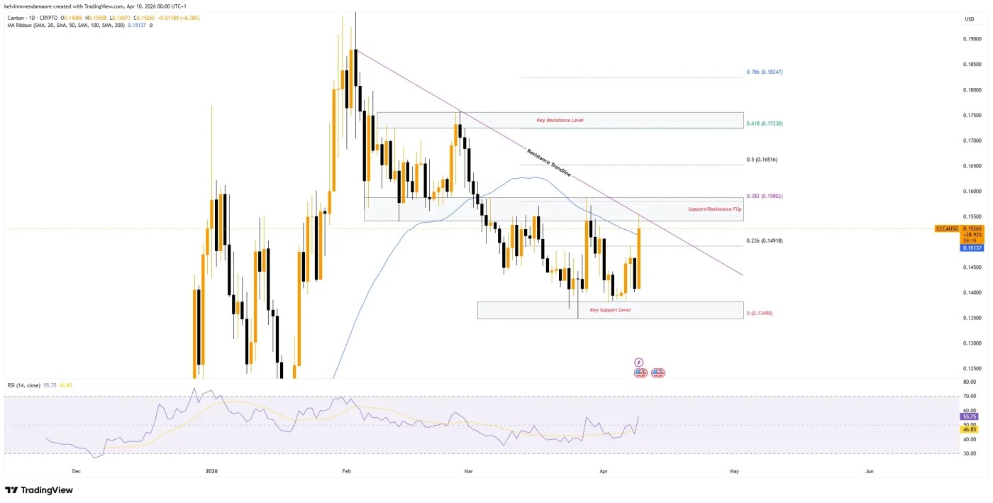 On the daily chart, Canton ran into the $0.158-$0.154 range, an area that previously acted as support before flipping into resistance. After briefly touching that zone, Canton eased back toward $0.1529 and hovered near its 50-day moving average.