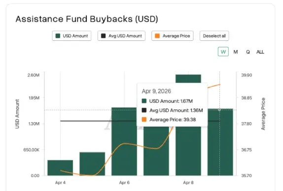 HyperliquidX Assistance Fund went through another round of buybacks yesterday. Records indicate an outlay of 1.67 million dollars for the acquisition of 42,446 $HYPE tokens in that timeframe. This was averagely priced at $39.38 dollars. The chart below shows the current USD value of the day in a sequence of daily values starting April 4 with the price metric increasing during the period.
