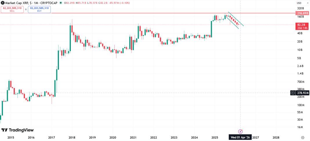 Meanwhile, $XRP’s $ATH valuation was $216.69 billion, attained when its price rose to $3.6 in July 2025. From this top, $XRP needed an additional 361% increase to reach $1 trillion. The $XRP market cap has continued to slide since the $216 billion high, entering a falling channel pattern on the 1-month chart. At the current valuation, $XRP needs a 1,114% rise to reach a $1 trillion market cap.