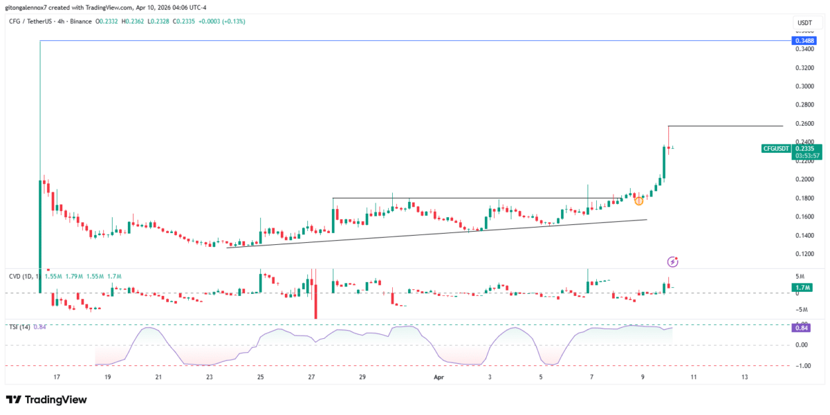 On the 4-hour chart, $CFG broke out of an ascending triangle consolidation with the price spiking to $0.26. Shortly, sellers countered the move, and the altcoin has since dropped to $0.2267.