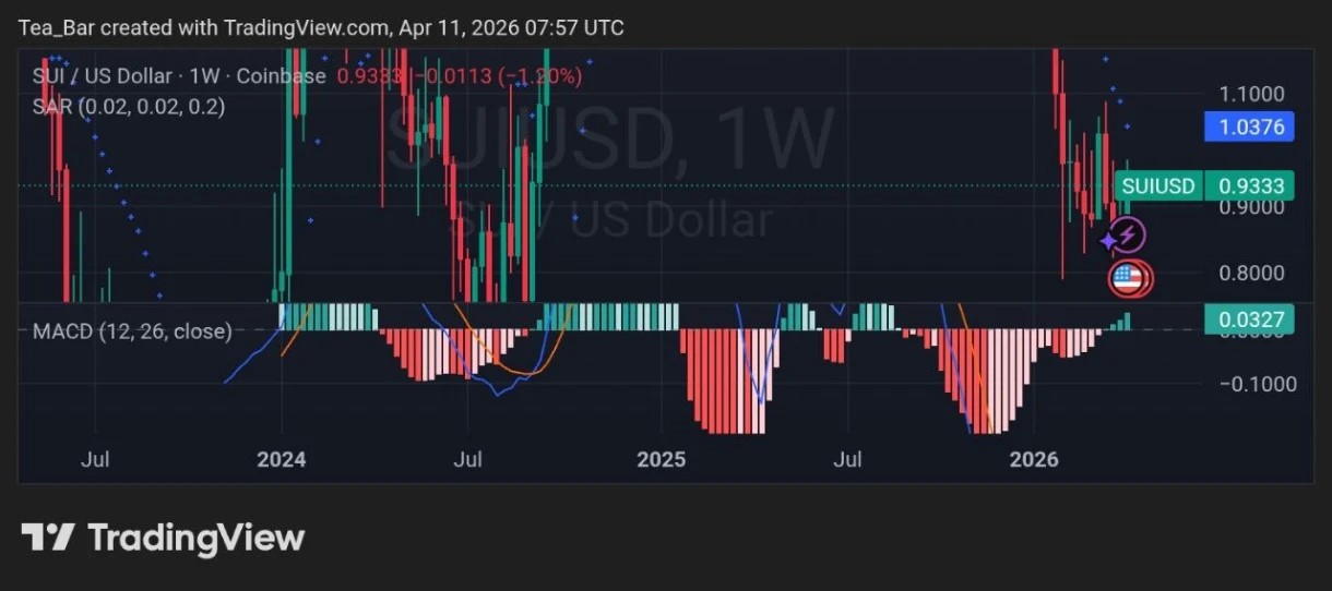 On the $SUI/USD weekly chart (April 11, 2026 — 07:57 UTC), price trades near $0.9388, down 82% from its $5.35 all-time high.