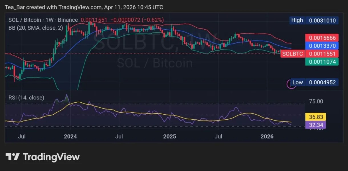 On the $SOL/$BTC weekly chart, price sits at 0.0011551 $BTC, the pair has collapsed from its 2024 peak of 0.003101 $BTC — a 63% underperformance against Bitcoin.