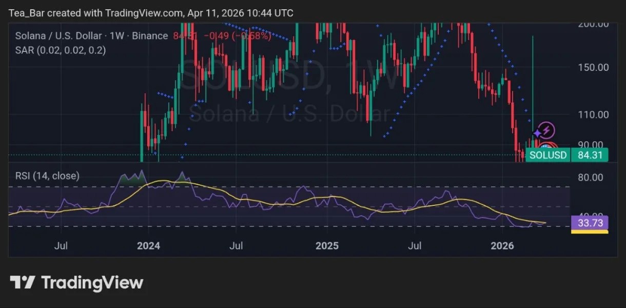 Price on the $SOL/USD weekly chart sits at $84 (as of April 11, 2026 – 10:44 UTC), trapped in a well-defined $90-$80. channel. The Parabolic SAR remains above price, signaling a corrective trend.