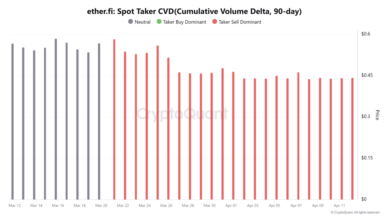 After $ETHFI climbed to $0.64 on the 21st of March, the altcoin experienced extreme profit-taking, and sellers took over the market. Since then, the altcoin has mostly recorded sell-side activity, as the Spot Taker CVD showed sell dominance for the past three weeks.