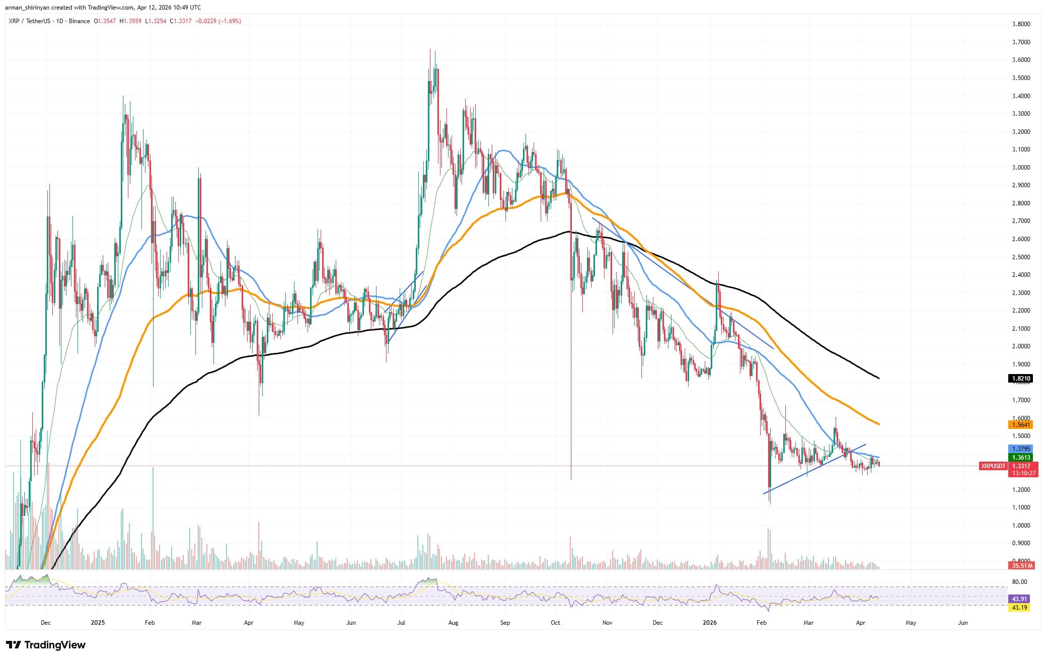 In terms of price action, $XRP continues to be in a wider downward trend. The chart displays a sequence of lower highs and persistent pressure from major moving averages, all of which are still higher than the current price levels.