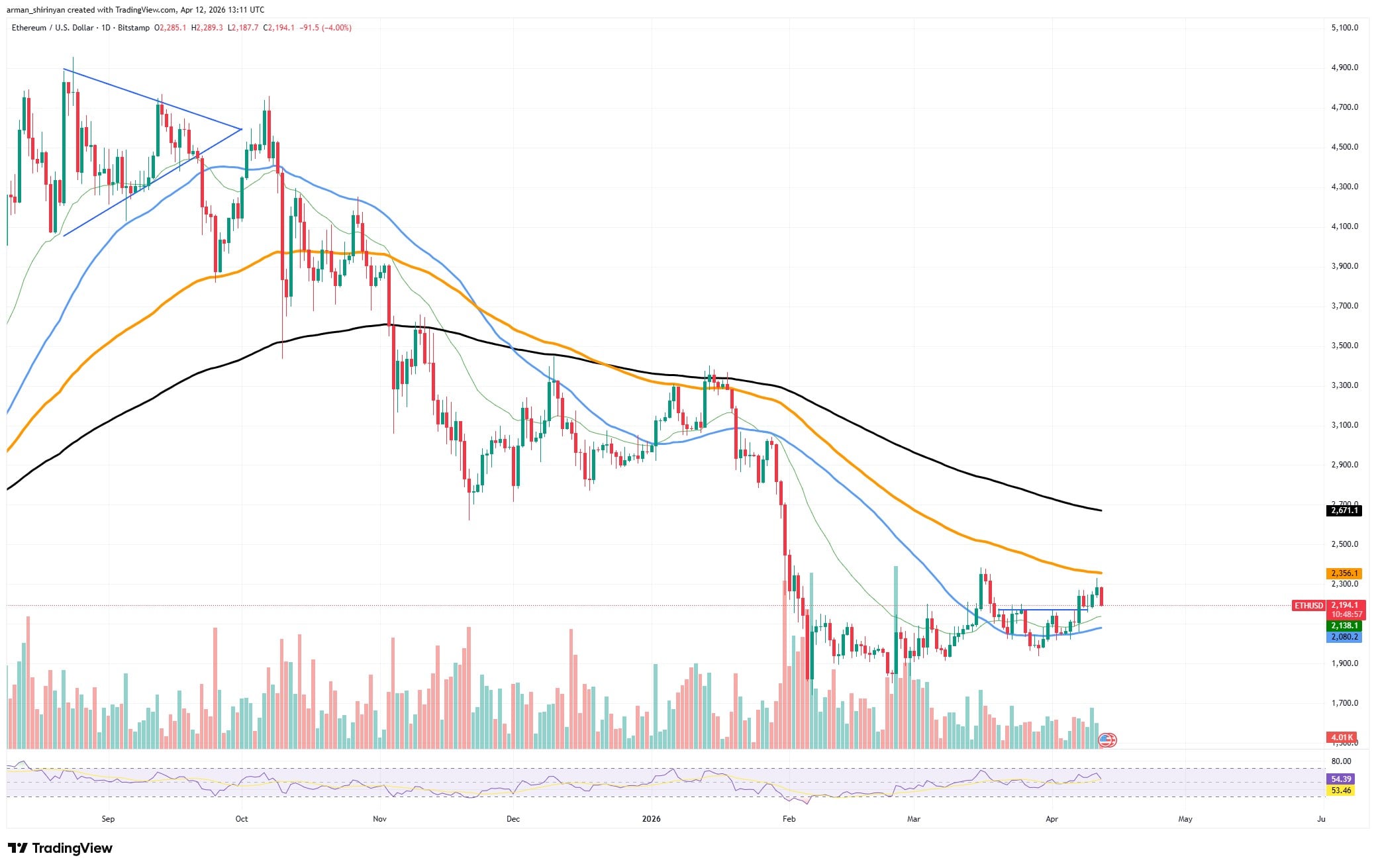 Bitcoin is still trading below significant higher-time-frame moving averages, which are still declining. This supports the notion that the current move is more likely a corrective bounce than the beginning of a new impulse, and that the overall trend has not yet turned bullish.