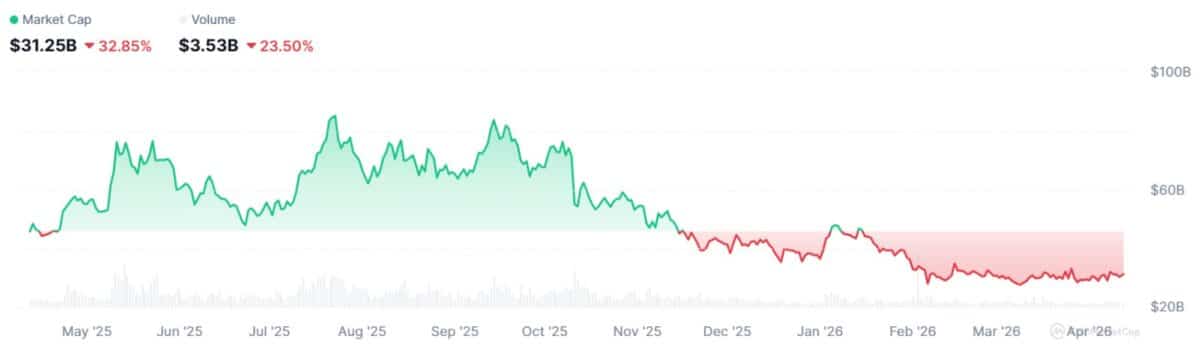Memecoins faced heavy losses as broader market weakness persisted. The sector’s market cap dropped from $83 billion in 2025 to $31 billion. Trading Volume also declined from $17 billion to $3 billion.