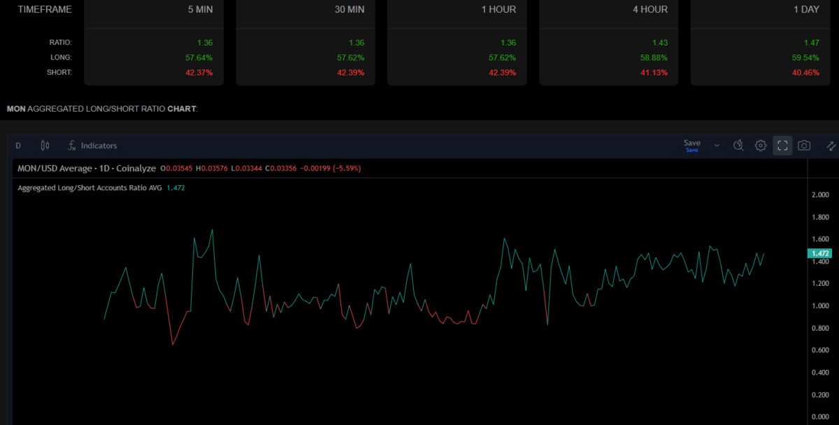 While $MON’s price action is undergoing a pullback, derivatives data tells a slightly different story. Long positions continue to dominate the market, accounting for around 60% of total positions. The Long/Short Ratio was at 1.47 as of writing, indicating that traders were not rushing to exit. Instead, they were maintaining a bullish stance despite the recent dip.