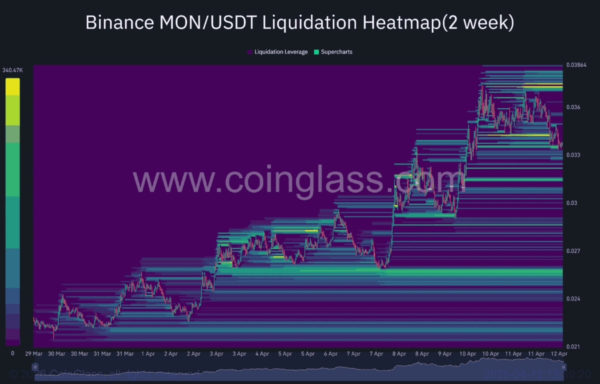 Moreover, traders can remain bullishly biased on $MON until the $0.02912 level is breached. That level continues to act as the line separating continuation from breakdown. As long as the price holds above it, the current correction does little to invalidate the broader trend.