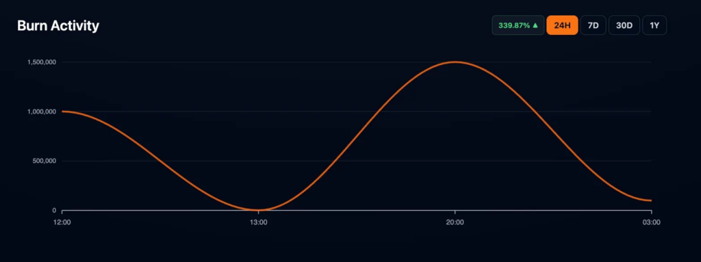 The 24-hour chart opened near 1M $SHIB per hour at 12:00, dipped briefly around 13:00, then climbed to 1.5M per hour by 20:00 before falling sharply and hitting near zero by 03:00. The 339.87% headline is real, but the activity was concentrated in a narrow evening window.