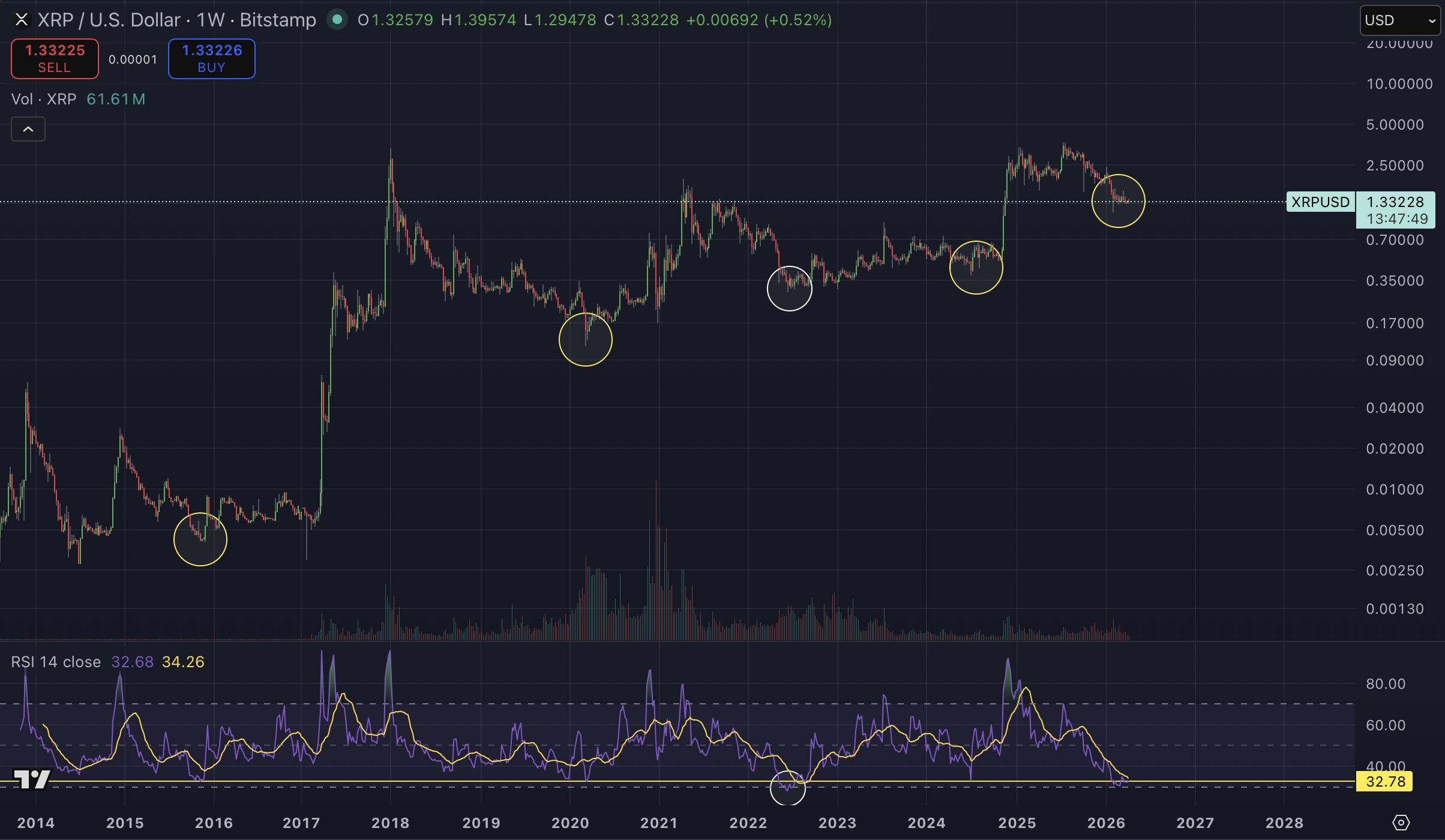 - The weekly $XRP RSI has crashed below 32.78, currently sitting at 32.37, as the price stands at 1.33.