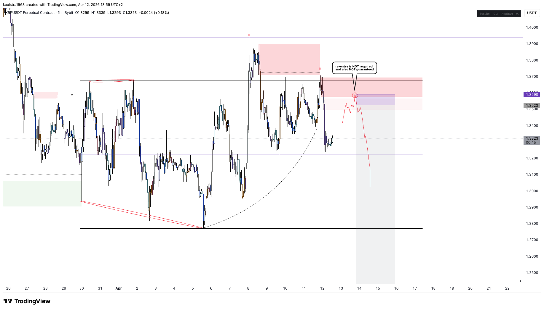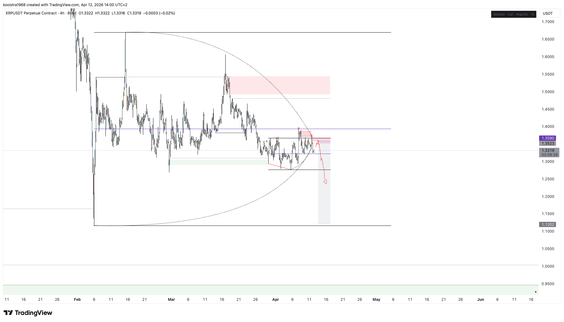 The latest chart shows $XRP struggling below a major supply zone around the mid-$1.30s, with price currently hovering near $1.33.