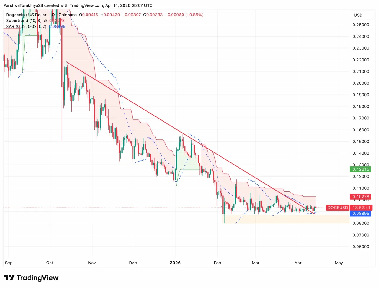 Price at $0.0933 sits in the lower half of the channel, with the upper boundary sloping down near $0.1000 to $0.1028, overlapping almost exactly with the Supertrend. That makes $0.1028 the single level that matters. A daily close above it breaks the channel ceiling and Supertrend together. Below, SAR at $0.0890 is the first support, then the channel floor at $0.0820.