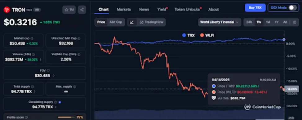 During this dispute, the TRON price has maintained a stable trend compared to the $WLFI price over the past week. To validate this, a comparative price trend from CoinMarketCap reveals that $TRX and $WLFI moved in opposite directions during the one-week period. The TRON price remained unchanged as its movement showed less volatility than $WLFI.