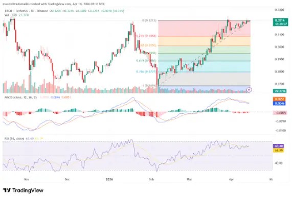According to a TradingView technical analysis, TRON extended its recovery from the February low and continued climbing through the Fibonacci retracement structure. TRON price moved above the 0.786, 0.618, 0.500, 0.382, and 0.236 retracement levels during the advance. That sequence showed sustained upside control across the swing.