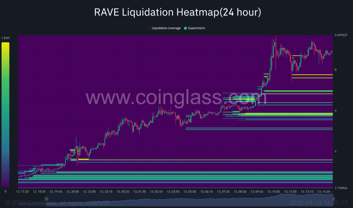 $RAVE’s move away from the $14.97 high into the $11–$12 range reflects a shift from expansion into rebalancing, as early participants lock in gains while new entrants absorb that supply. This rotation matters because Open Interest (OI) rose by 10.64% in 24 hours at press time, showing that capital was not leaving but repositioning through fresh leveraged exposure.