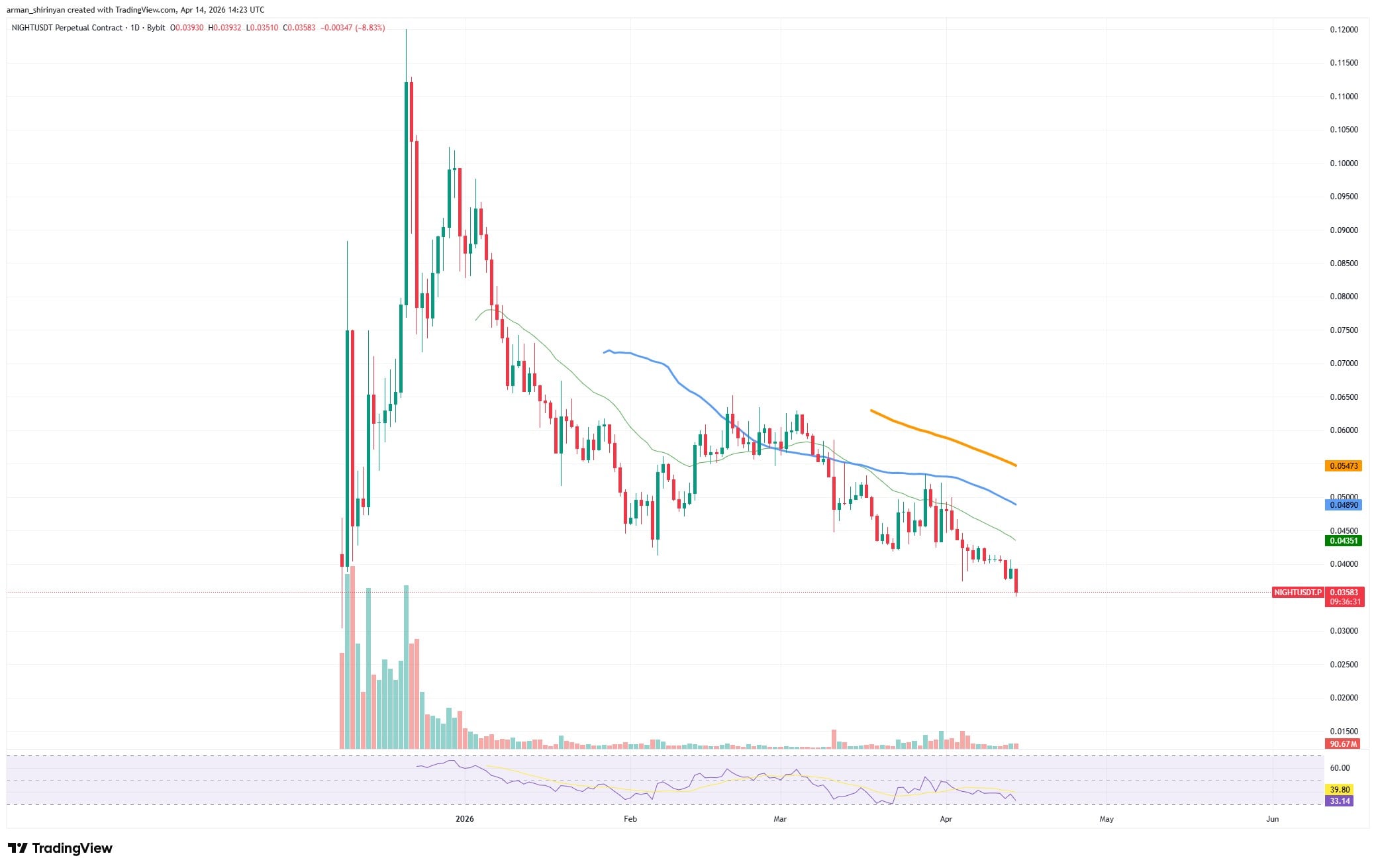 $NIGHT is currently falling steadily under all major moving averages, trading between $0.035 and $0.036. With lower highs, lower lows and numerous unsuccessful attempts to recover resistance levels, the chart structure is blatantly bearish.