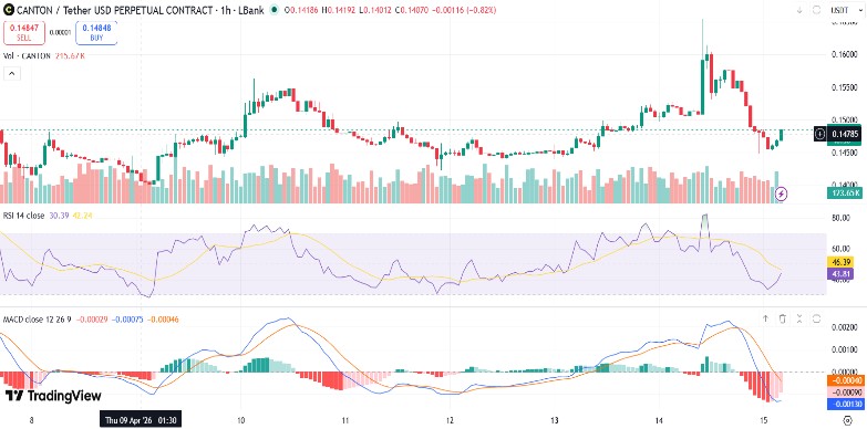 Despite the drop in the price, the daily trading volume of Canton has witnessed a spike of around 345% on a daily chart, which shows growing trading activity on the network. At the time of writing, the cryptocurrency is trading at around $0.1463, down 3.9% on the daily chart, according to CoinMarketCap.