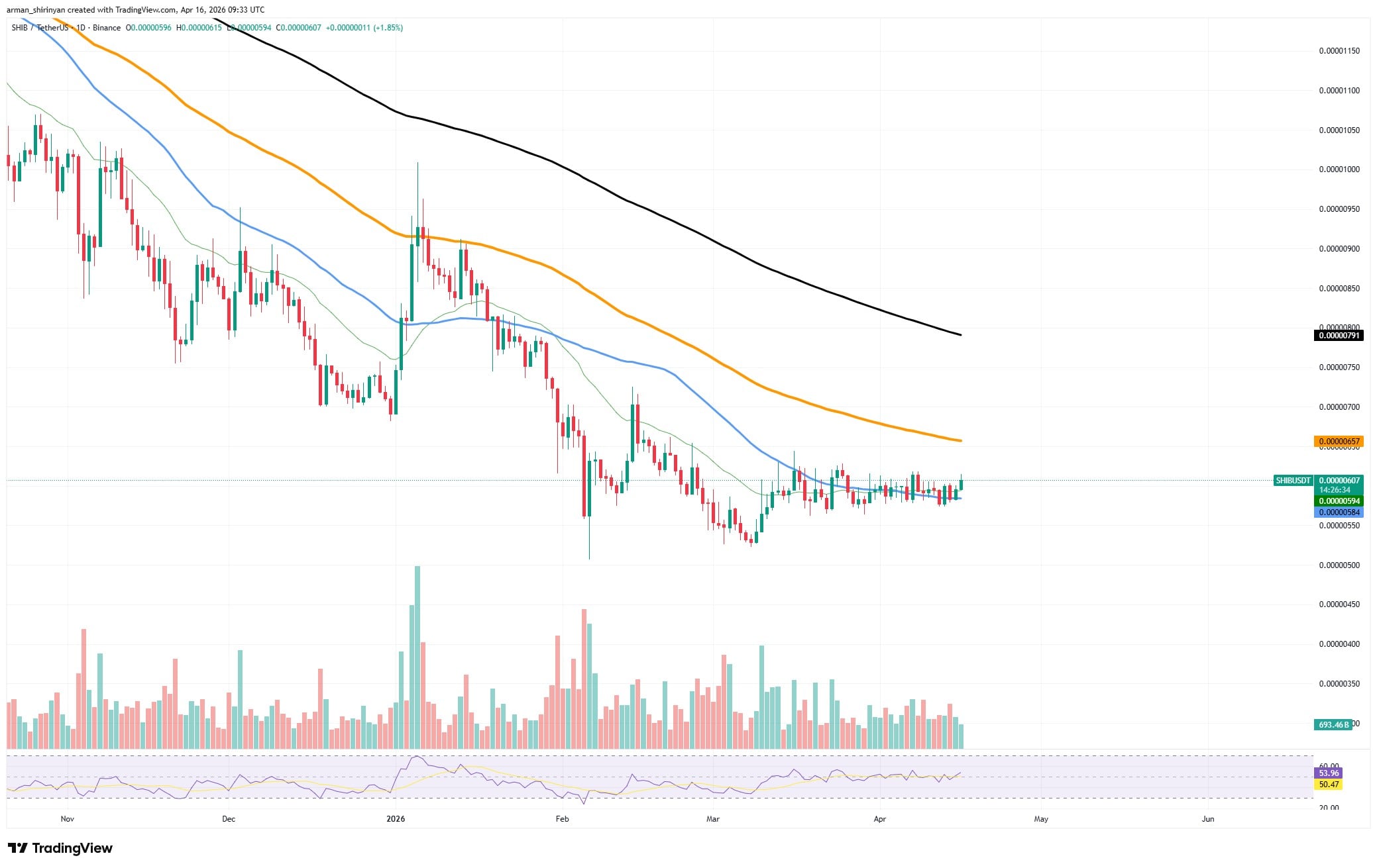 That change is partially reflected in price. Currently trading at $0.0000060, $SHIB is still in a tight consolidation phase. The price is hugging short-term moving averages as the chart depicts a protracted downtrend that is changing into a flat, low-volatility range. Although it is not yet a breakout, it is also not actively selling off.