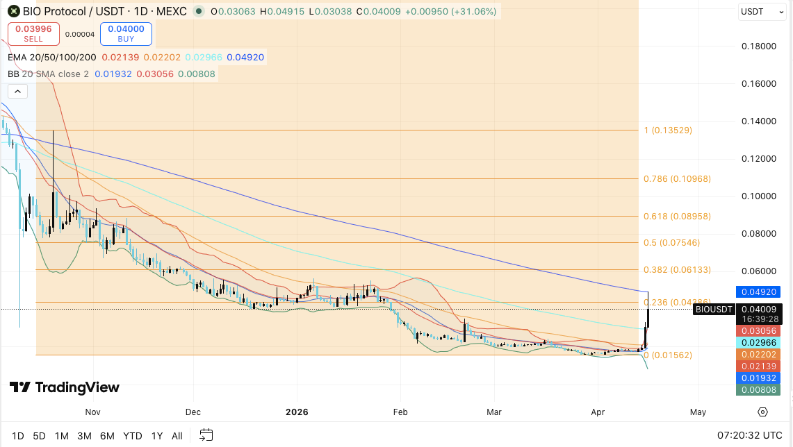 Bio Protocol ($BIO) has entered a high-volatility phase after a sharp rally pushed price toward $0.040. The move followed a prolonged downtrend, where price stayed below major EMAs for months.