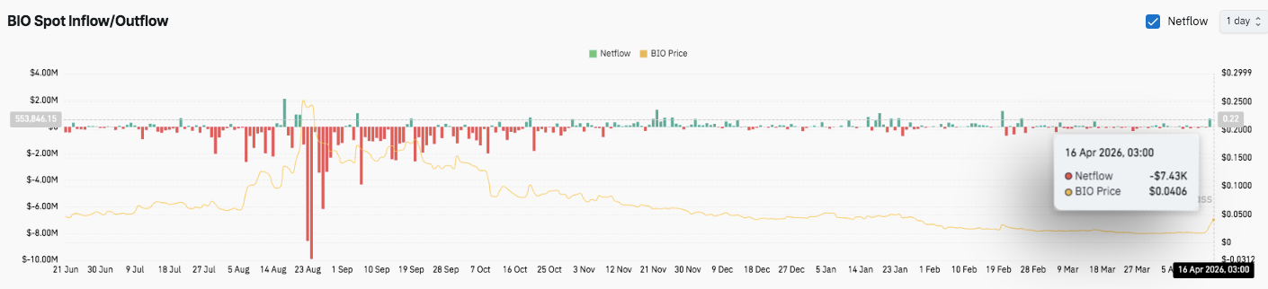 Additionally, $BIO has gained over 93% in 24 hours and more than 120% in seven days. This sudden move has shifted sentiment, although broader trend signals still point to caution.