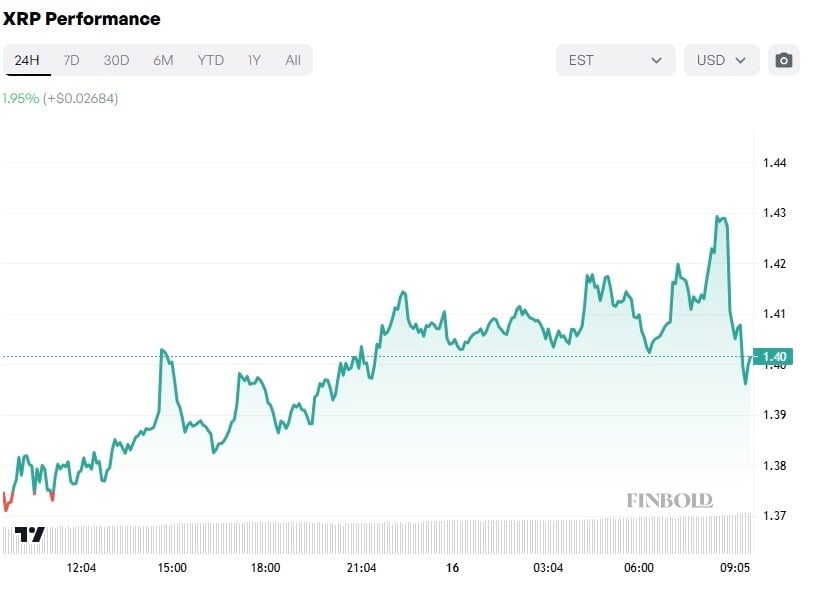 The price of this token rallied as much as 4% on Thursday, reaching a 24-hour high of $1.43. As of press time, $XRP price had gained 1.95%, thus trading at about $1.40.