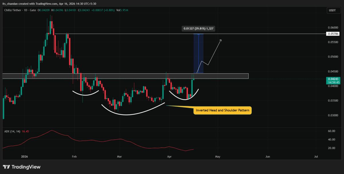 Looking at the daily chart, $CHZ’s 17.11% gain appears to have pushed the asset close to a breakout from a bullish price action pattern. According to the chart, the asset has formed a textbook-style inverted head and shoulders pattern, with the price approaching a breakout above the neckline at the $0.0445 level.