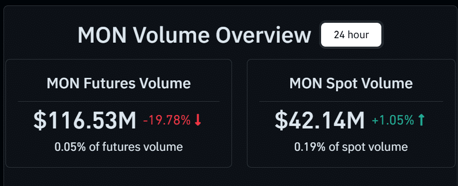 Accompanying this price pullback is a drop in trading volume. In the past 24 hours, trading volume has declined by 3% as market participants prefer to stay on the sidelines and observe Monad’s price trend.