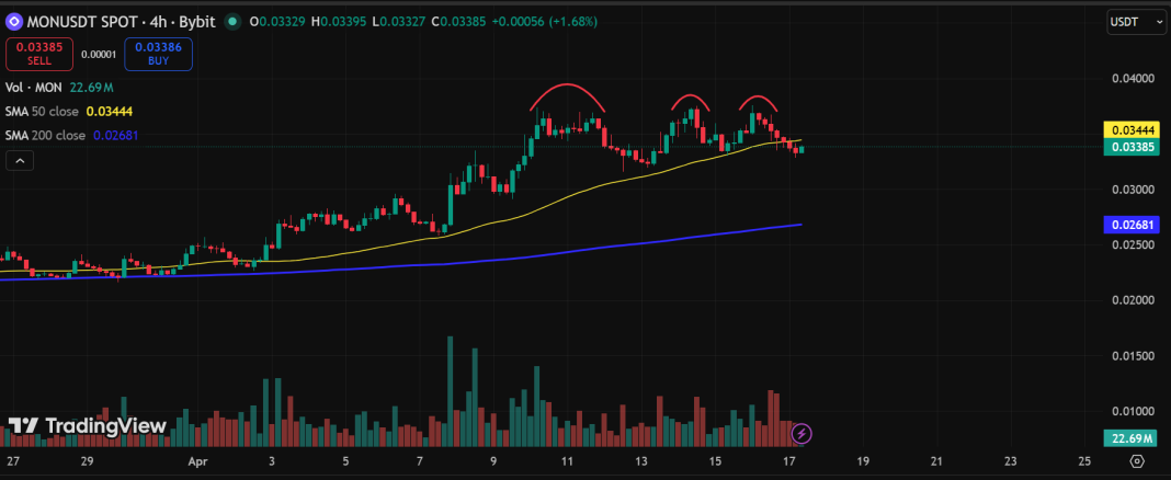 On April 16, it rallied again to an intraday high of $0.0375. The token met strong selling supply again and still couldn’t overcome it. From the high, Monad has dropped 10% to its current price level.