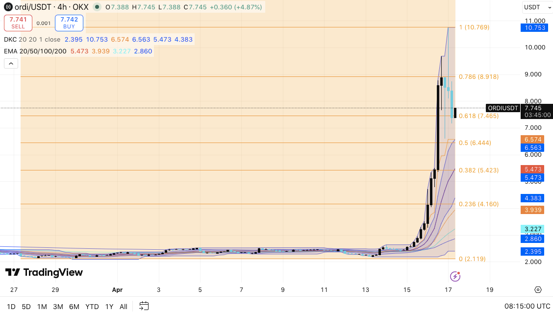 $ORDI climbed rapidly from near $2 to a peak above $10.7, forming a parabolic advance. Such moves rarely sustain without retracement.
