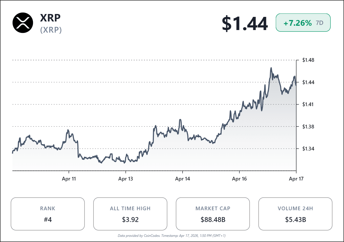 Price action over the past week has shifted modestly in favor of buyers, with $XRP up 7.26% to around $1.44, according to CoinCodex data. The move brings it closer to the upper edge of its current range, signaling a pickup in short-term momentum.