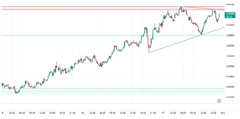 The visual data highlights a formidable “pink zone” of resistance between $0.0908 and $0.0910. This area represents a major supply ceiling where the bulls were rejected earlier today. The price is currently trading at $0.09009, hovering near the apex of a localized symmetrical wedge. For a confirmed macro trend reversal, the asset needs to print a high-volume close above the $0.0910 mark, which would signal that the sellers have finally exhausted their inventory.