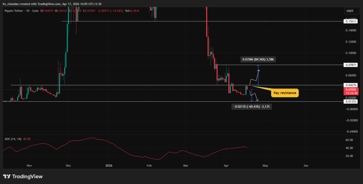 However, a potential rally is only possible if PIPPIN clears this key hurdle and closes a daily candle above the $0.04276 level. If that happens, the price could see an upside move of over 85% and may reach the $0.075 level.