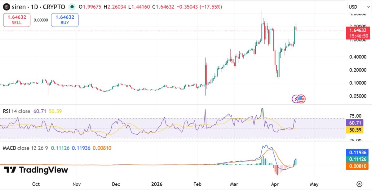 As of this writing, $SIREN traded at $1.7, up 102% on the daily charts, adding to its 136% weekly rally.