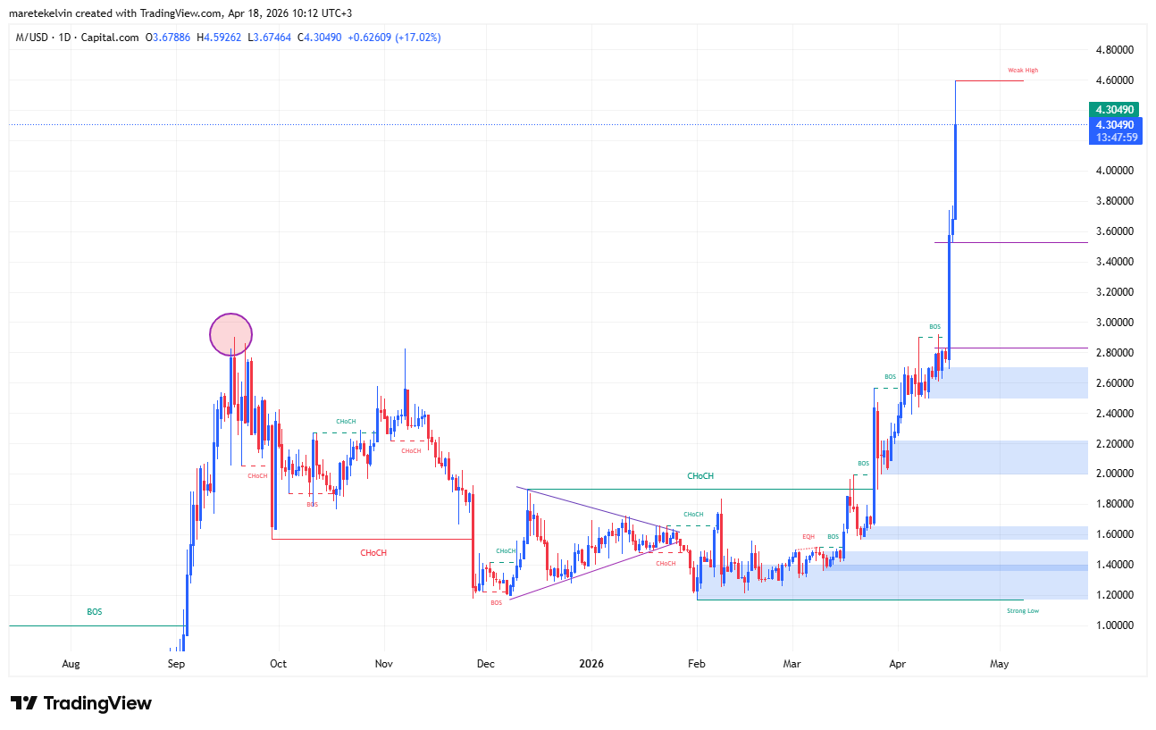 Instead, M broke above it and continued trending, which usually reflects strong underlying demand rather than a temporary spike. The bullish momentum, at least for now, is still intact.