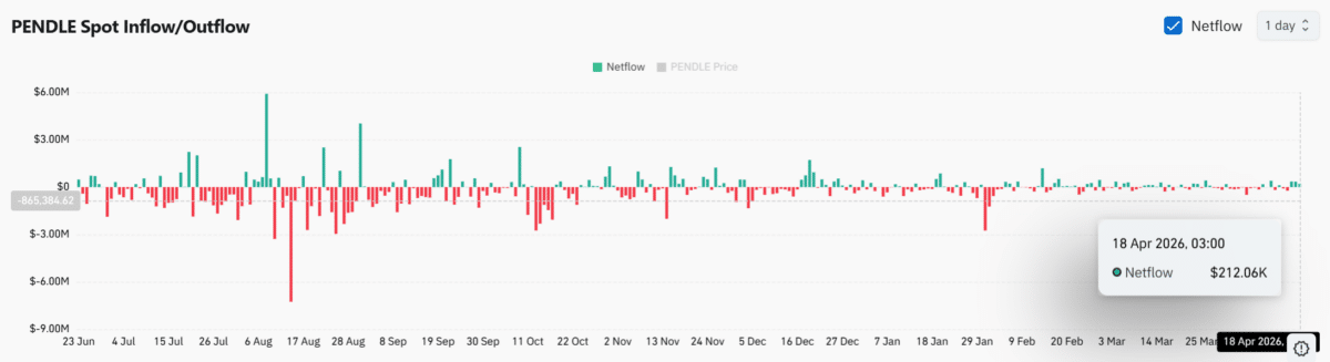 Growing activity within Pendle’s ecosystem has supported this price expansion beyond speculative trading. A surge in yield-focused strategies, particularly around apxUSD liquidity, has reflected increased engagement with its tokenization model.