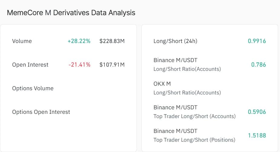 MemeCore [M] saw momentum turn bearish as sell pressure increased across the market.