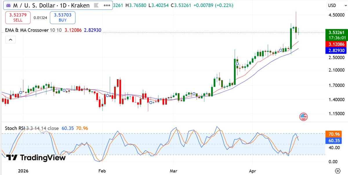 MemeCore faced strong rejection at $4.7, then breached $4 support and fell to a local low of $3.2. At press time, token M traded at $3.4, down 24.09% on the daily charts.