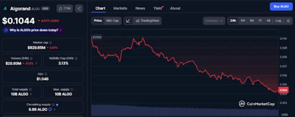 During today’s Asian trading session, Algorand’s price opened at $0.1076. This opening price in $ALGO did not show an uptrend or sideways movement to indicate stabilization. Instead, the Algorand price followed a clear dip. At the time of writing this piece, Algorand recorded a weak 24-hour performance, with the $ALGO-3.01% falling to $0.1044 and losses reaching 4.01%. The session moved lower early and kept that negative direction through most of the period. That opening slide placed the Algorand price under pressure and shaped the rest of the movement.