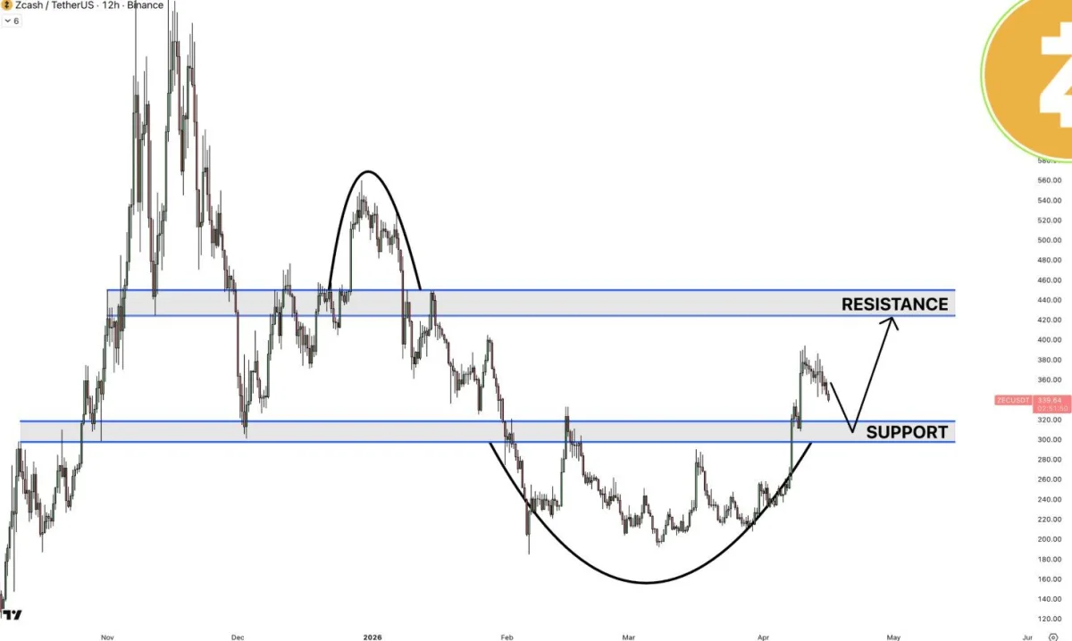 On the 12-hour chart, $ZEC price is still trying to transition from a recovery phase into a broader reversal structure. The chart shows a rounded base forming from the February lows, with price moving back into the $310 to $330 zone. That area now acts as a key support band after the recent attempt to break higher.