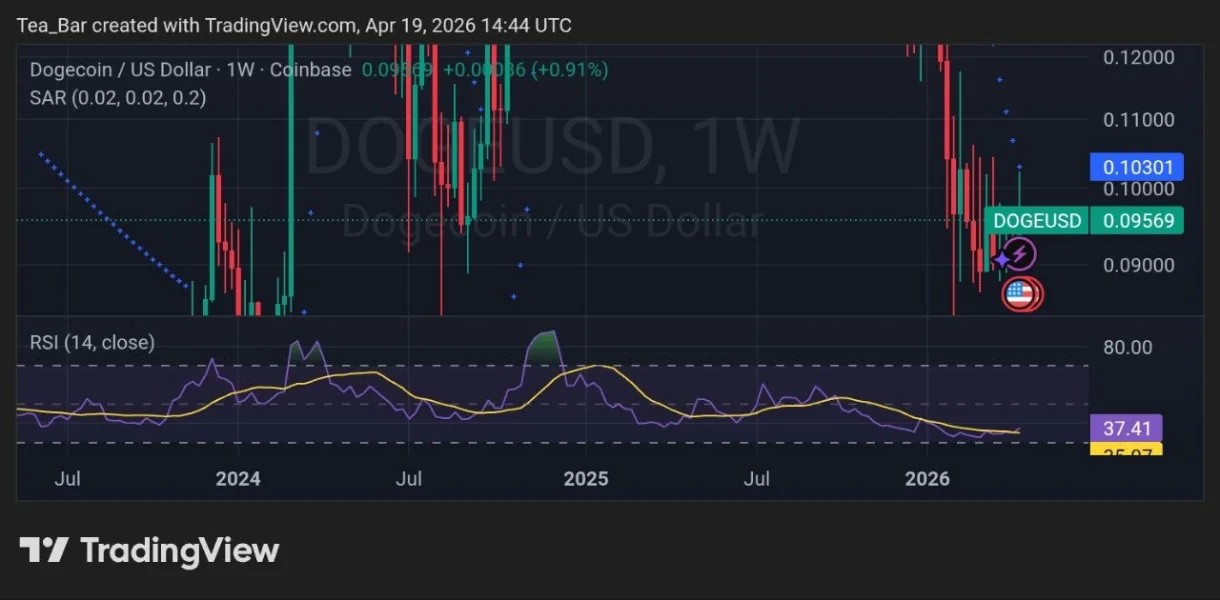 On the $DOGE/USD pair (Coinbase) as of April 19, 2026 at 14:44 UTC, price trades near $0.095, up a modest 0.91% on the period, with Parabolic SAR positioned above price, indicating short-term caution.
