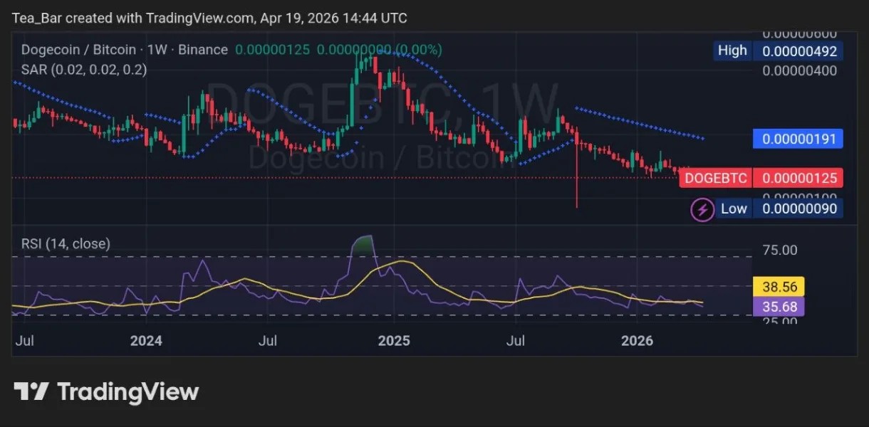 On the $DOGE/$BTC pair (Binance) as of April 19, 2026 at 14:44 UTC, the ratio holds near 0.00000125 with minimal change, showing $DOGE largely moving in line with Bitcoin.