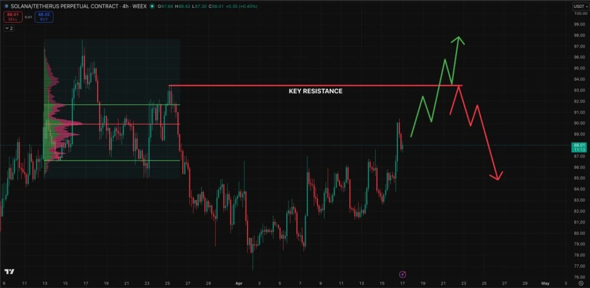 If Solana clears that resistance, the chart points to a possible move toward higher levels in the mid to upper $90s. The green path on the chart suggests a breakout scenario with continued advances after a brief test of the zone. That would turn the current resistance area into the main level to watch for confirmation.