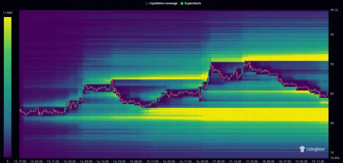 The heatmap also suggested that liquidation levels were not evenly spread. Instead, they gathered in tight bands, which usually creates clearer targets for short term moves. Therefore, traders may treat $90 as the main upside trigger and the sub $85 area as the more immediate downside magnet.