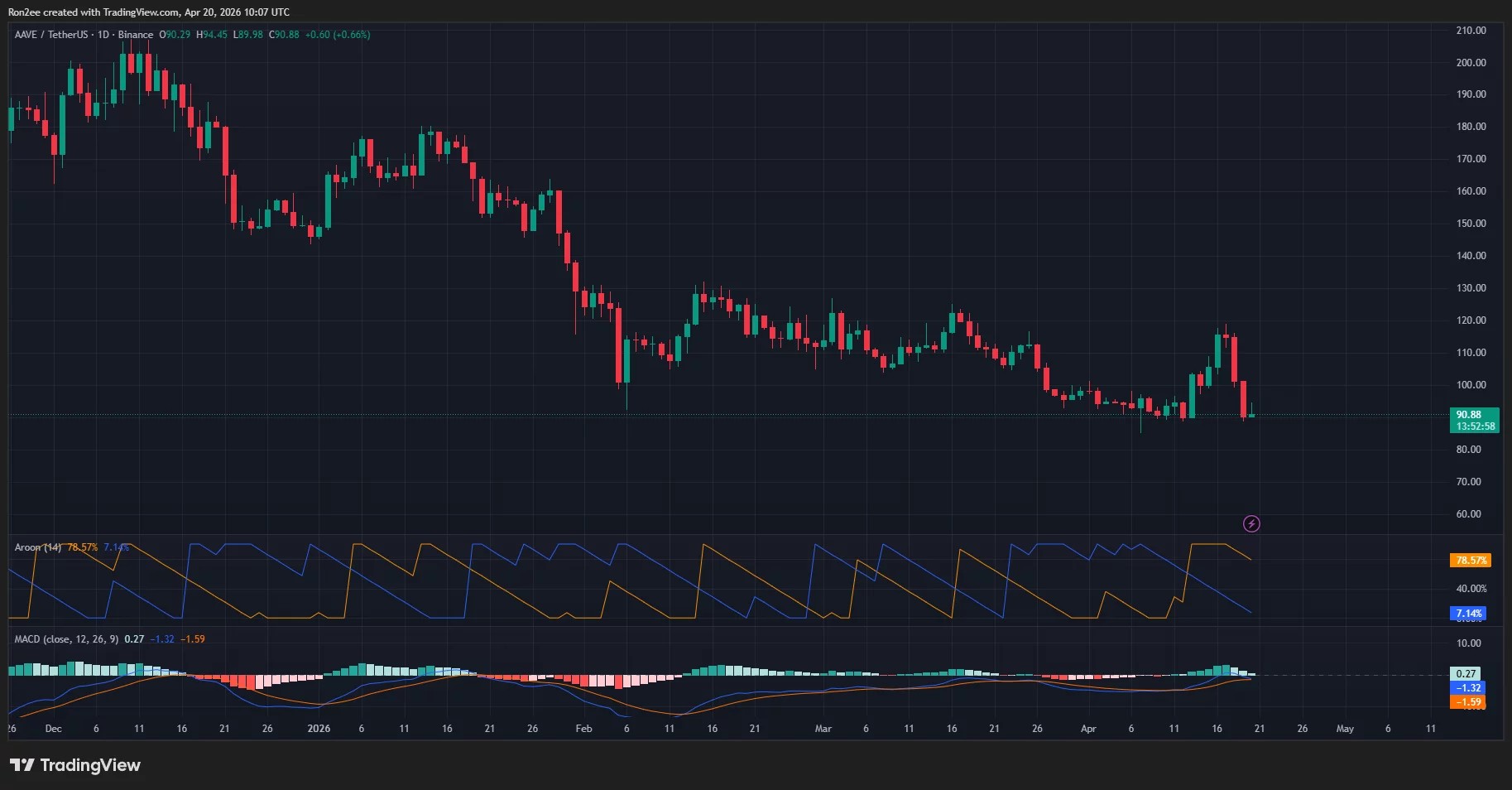 Aave price plummeted nearly 20% to around $90 by Monday morning following a massive exploit at Kelp DAO that left the protocol saddled with roughly $196 million in bad debt.