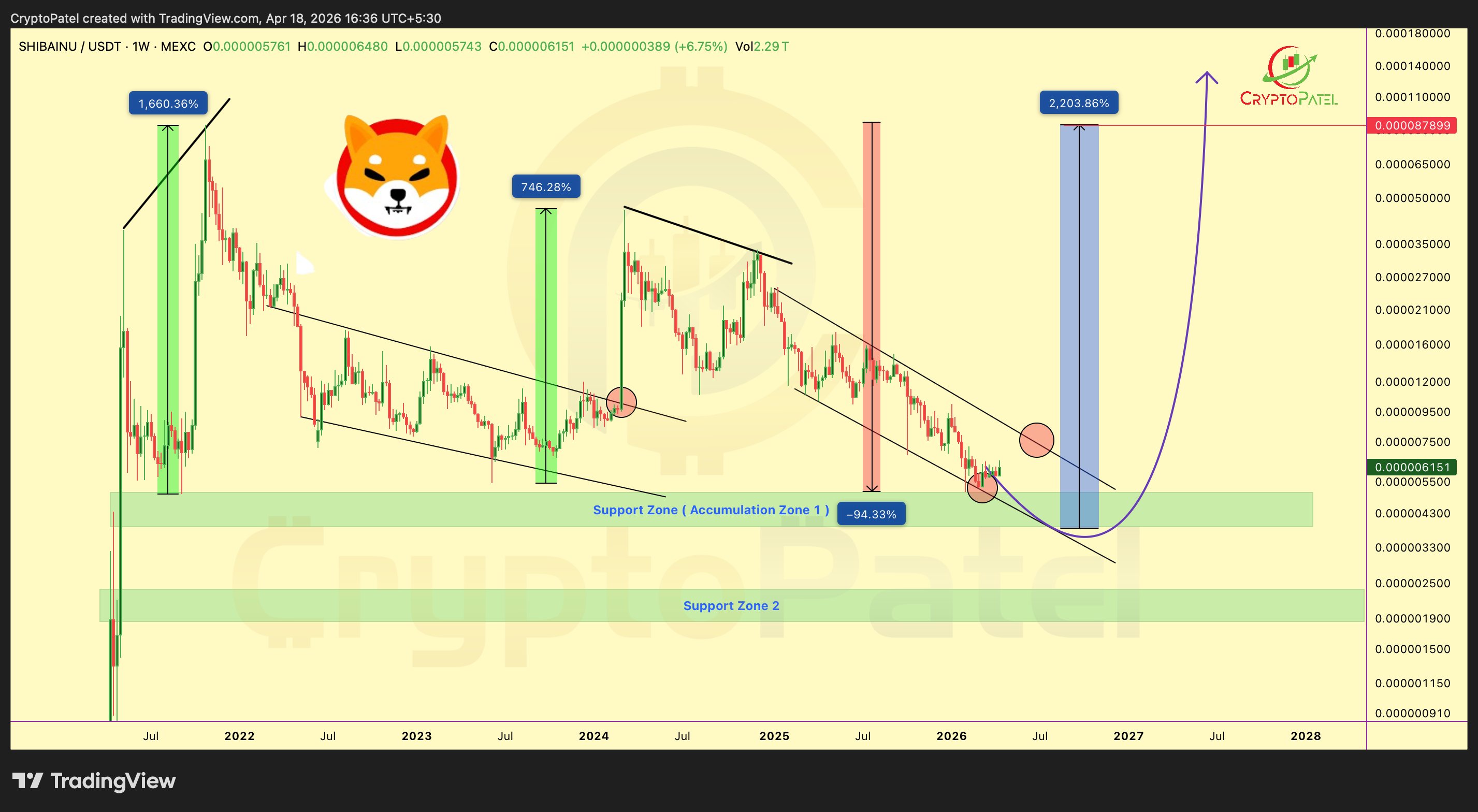 He identifies this level as a historically reliable launchpad for major price expansions. Specifically, Patel shows that $SHIB is trading within a clearly defined accumulation range labeled “Support Zone (Accumulation Zone 1).”