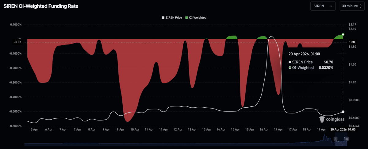 Derivatives data shows a clear contraction in market exposure even as price trends higher. According to CoinGlass, $SIREN’s Open Interest (OI) declined by roughly 15% to $7.59 million over the past day.