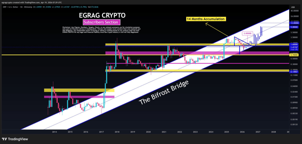 Furthermore, $XRP price has consolidated for more than a year since breaking out of its multi-year resistance range between $0.70 and $1.60, according to trading expert Egrag Crypto. As such, $XRP price could kickstart a fresh parabolic rally towards a new all-time high (ATH) in the coming months, if it consistently closes above $2.00.
