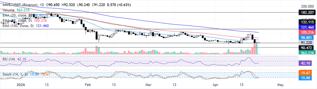 In the daily chart, $AAVE trades at $91.22, maintaining a bearish near-term tone as price holds below the 20-, 50- and 100-period Exponential Moving Averages (EMAs), which now cluster as overhead supply. The Relative Strength Index (RSI) around 42 and a depressed Stochastic Oscillator (Stoch) near 15 suggest weak but stabilizing downside momentum, hinting that sellers remain in control while immediate recovery attempts are likely to face selling pressure into nearby resistance.